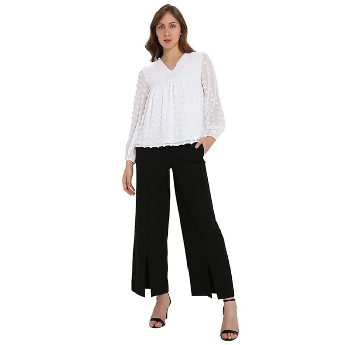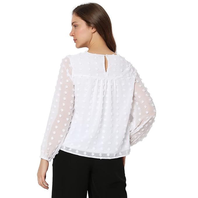Women’s white dobby textured full sleeves top with a V-neckline. Pair with jeans or culottes for an effortless look.